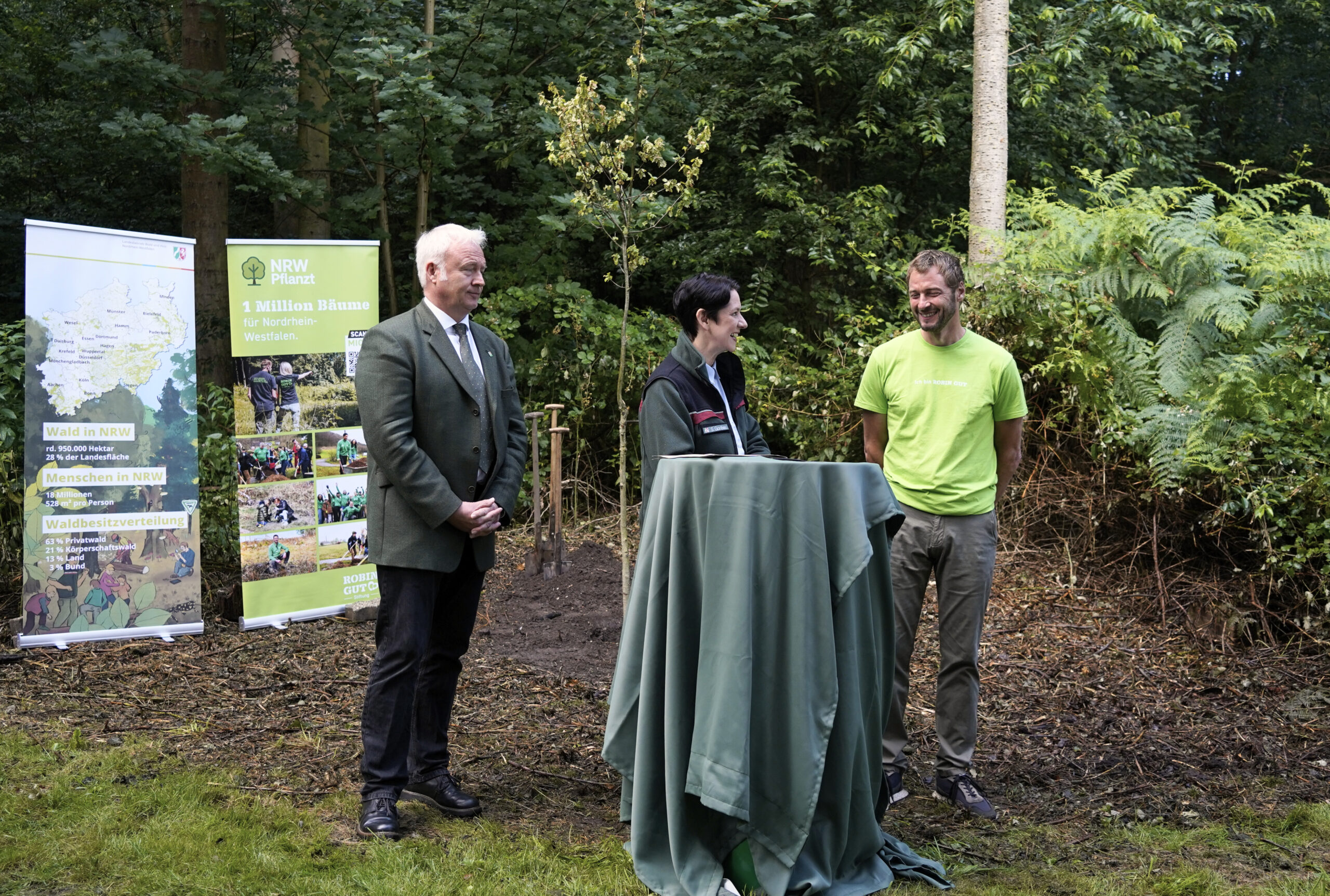 Ministerin Gorißen, Thomas Kämmerling, Leiter des Landesbetriebs Wald und Holz, und Dieter Könnes, Mitgründer von Robin Gut, richteten klare Worte an die Anwesenden: Nur durch gemeinsames Handeln kann die ambitionierte Vision von 1 Million Bäumen in NRW Wirklichkeit werden.
